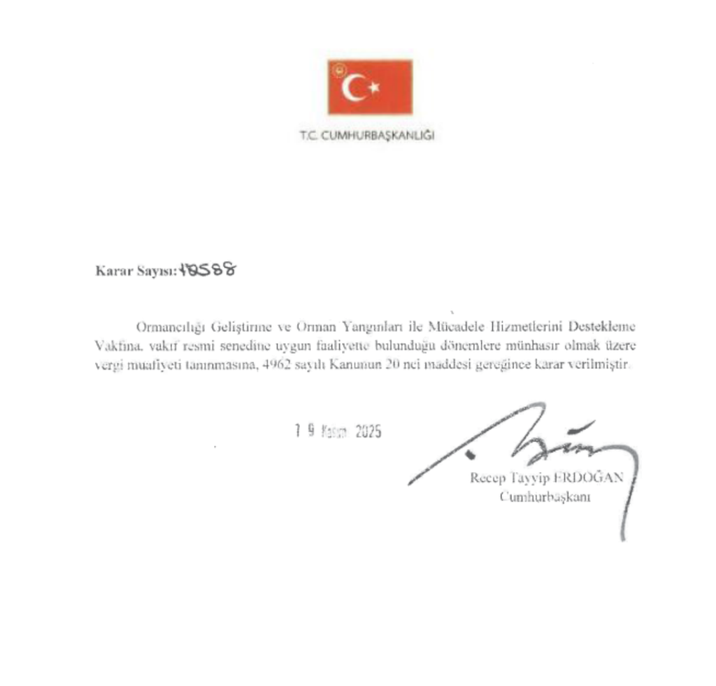 Cumhurbaşkanlığının 19.11.2025 tarih ve 10588 sayılı kararına istinaden Ormancılığı Geliştirme ve Orman Yangınları ile Mücadele Hizmetlerini Destekleme Vakfına (OGEM-VAK) vergi muafiyeti tanınmıştır.